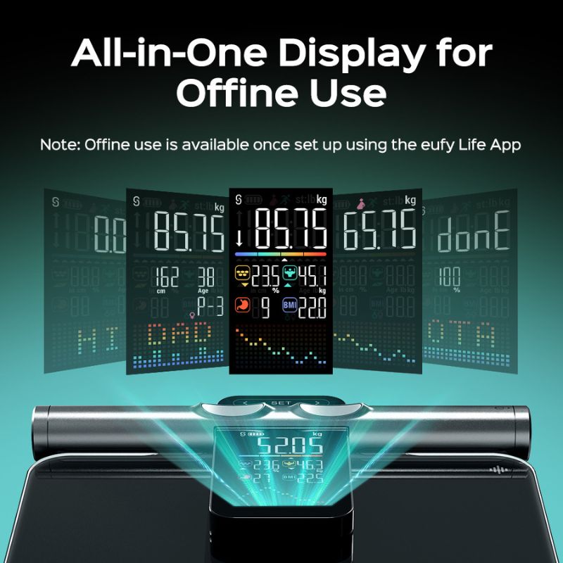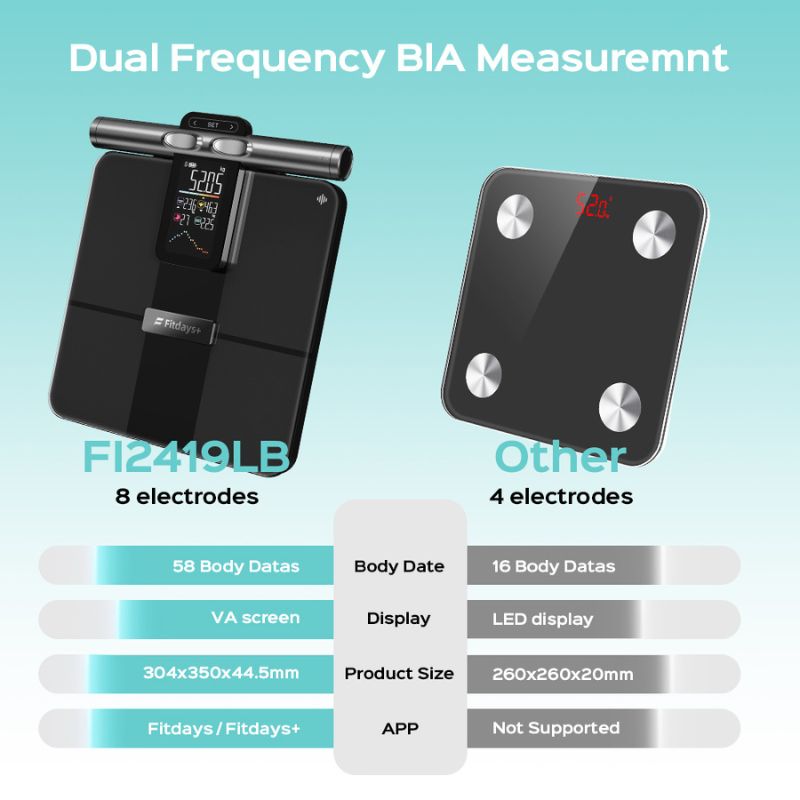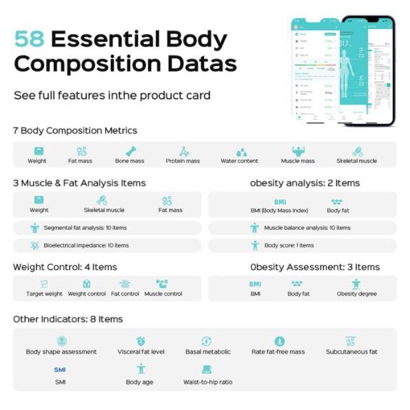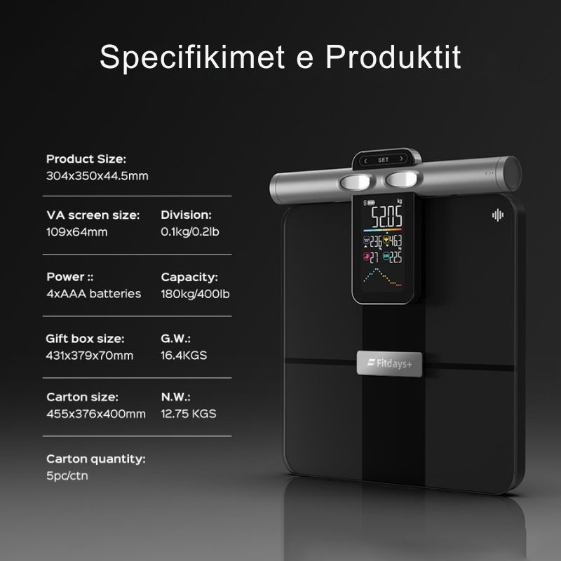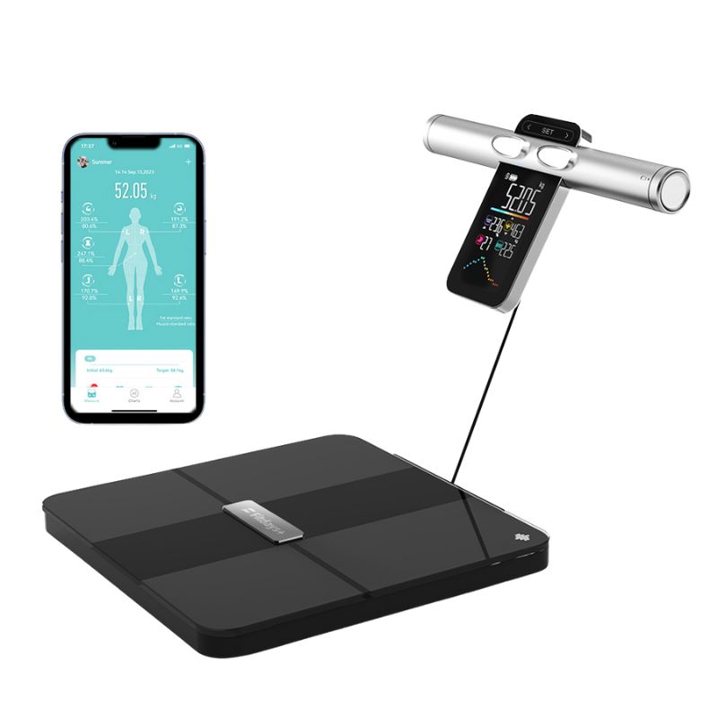 Peshore inteligjente e gjeneratës së re, e krijuar për të analizuar me saktësi përbërjen e trupit. Pajisur me 8 elektroda me precizion të lartë dhe teknologji Dual Frequency BIA, ajo ofron matje të detajuara për 58 tregues thelbësorë të trupit, si pesha, indeksi i masës trupore (BMI), përqindja e yndyrës, masa muskulore, masa kockore, uji trupor, etj.
